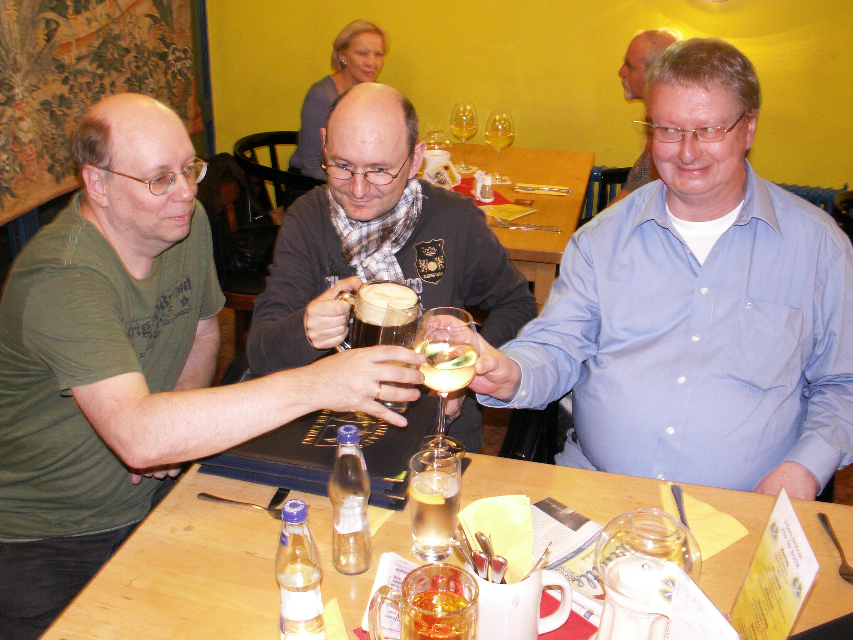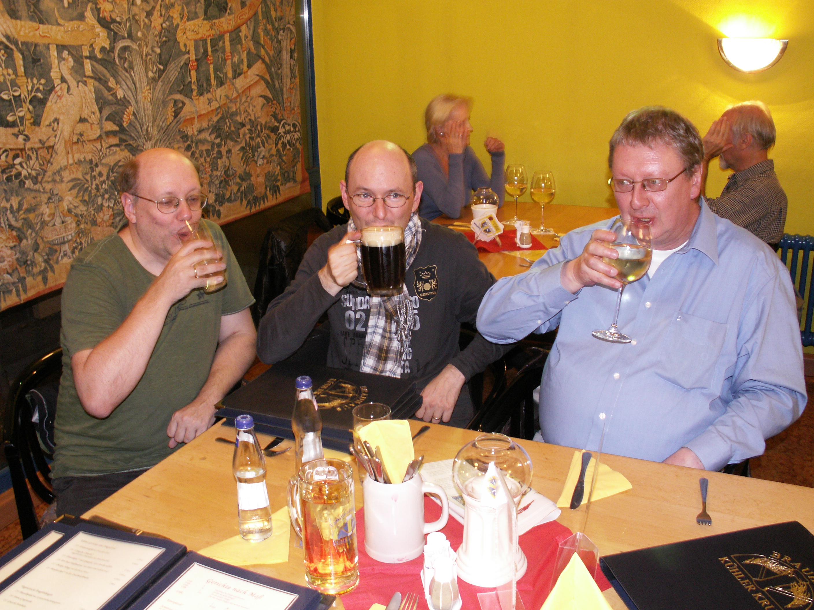 Ich habe das Gespräch mit den beiden unmittelbar nach Abschluß der Autorenkonferenz Mitte Oktober geführt, in einem Restaurant, eingeladen vom Verlag. Meine beiden Opfer blickten immer wieder sehnsüchtig rüber zur sechs Meter langen Tafel, die sich unter dekadenten Lukullitäten wie Fasanenzungen, Schweinskaldaunen oder Trüffelkompott bog und ächzte. Doch ich blieb unbarmherzig; sie mußten eine halbe Stunde lang darben und mir Rede und Antwort stehen. Herausgekommen ist folgendes Interview:
