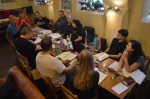 Heute geht’s los mit den Übungen. Erste Aufgabe: plotten. In Kleingruppen wird der Handlungsfaden für eine möglichst spannende, interessante, exotische Geschichte erarbeitet. Rings um mich brummen und glühen Köpfe …